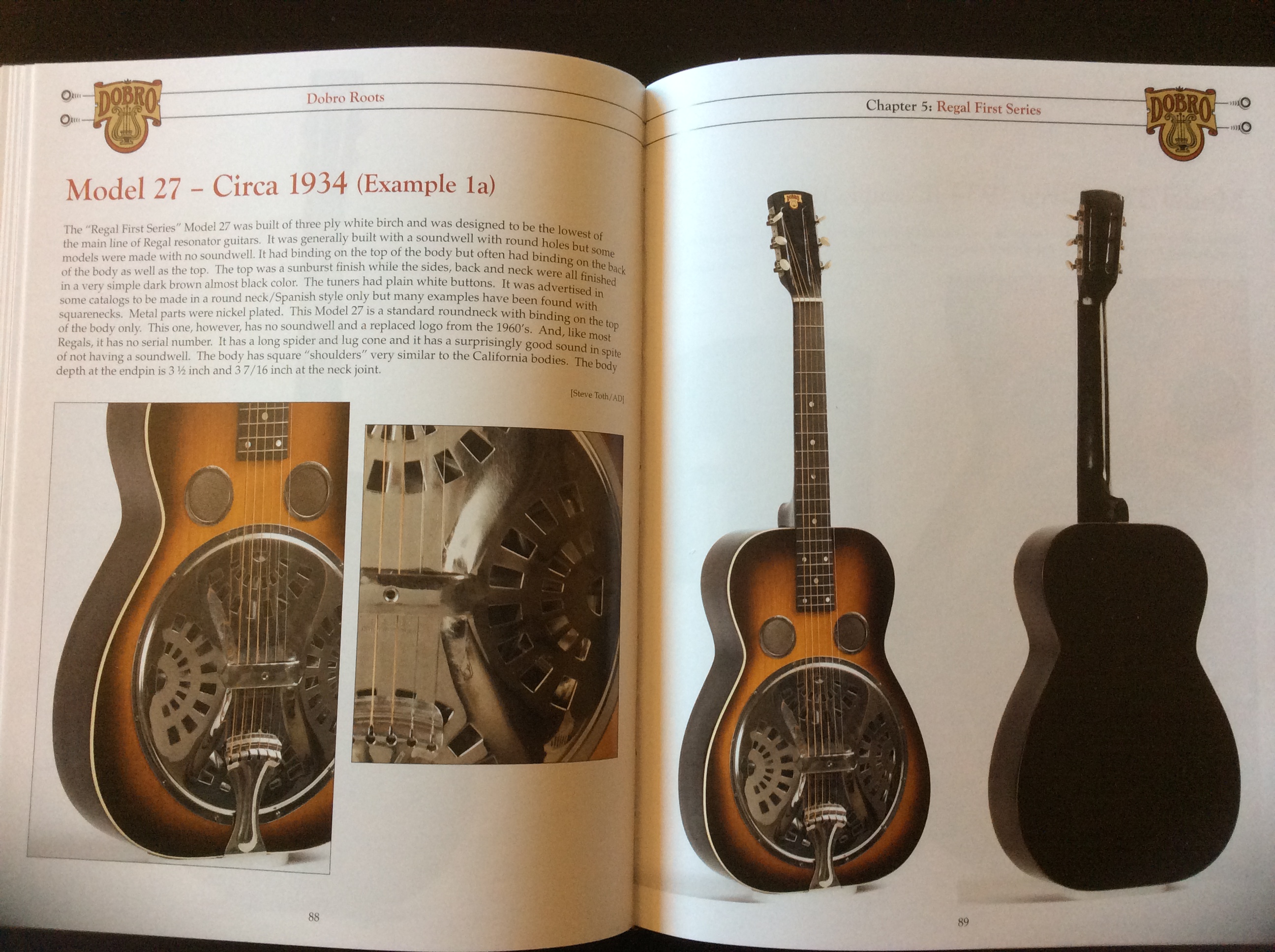 ST: DOBRO ROOTS starts out just like the title says – “DOBRO ROOTS” – A Photo Tour of Prewar Wood Body Dobros”. But it’s more than just a tour, it’s a tour in chronological order by model and follows each catalog series in the order they were released back in the 1920’s, 30’s and 40’s. It also includes details of the various models including dimensions and anecdotal details including old catalogs showing the various Dobro lines. I have also created a numbering system for the various lines and I designate them as separate “Series”. For instance, the first line to come out in 1929 had each model ending in the number “5”. It had the Models 45, 55, 65, 85, 125 and 175 so I call this the California 5 Series since these were all made in California by the Dopyera Brothers. The next line had model numbers ending in “6” so I call this the California 6 Series. Then, around 1933, Dobro issued the Regal Co. in Chicago the right to produce and sell Dobro instruments east of the Mississippi River. The initial line of instruments that Regal produced I have designated the Regal First Series.